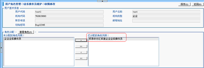在圖1-12所示界面,為該業(yè)務(wù)操作員分配“貿(mào)易收付匯核查企業(yè)業(yè)務(wù)操作員”角色,修改完成后,點擊保存按鈕,系統(tǒng)提示“修改權(quán)限成功”,如圖1-13所示。