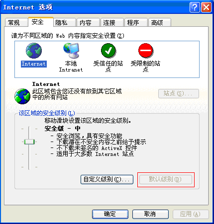 2、在彈出的窗口中選擇“安全”選項卡,點擊窗口右下方的“默認級別”按鈕,后單擊“確定”按鈕。如圖2-11: