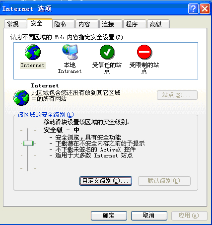 5、在彈出的窗口中選擇“安全”選項卡,單擊“自定義級別”按鈕。如圖2-14: