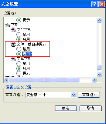 6、在安全設置窗口中找到“文件下載自動提示”項,在“文件下載自動提示”選擇“啟用”單選按鈕后單擊“確定”。如圖2-15:
