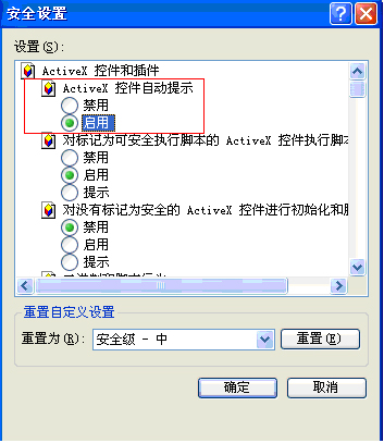 7、在安全設置窗口中找到“ActiveX控件自動提示”項,在“ActiveX控件自動提示”選擇“啟用”單選按鈕后單擊“確定”。如圖2-16: