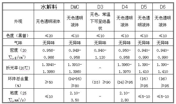 (二)二甲基硅氧烷混合環(huán)體(DMC),其是一種以二甲基二氯硅烷為主要原料,在經(jīng)過水解合成工序制得的水解物基礎(chǔ)上,再經(jīng)過分離或者裂解、精餾工序制得的一種以D3、D4、D5、D6為主的混合物,其中(D4+D5)含量≥80%。