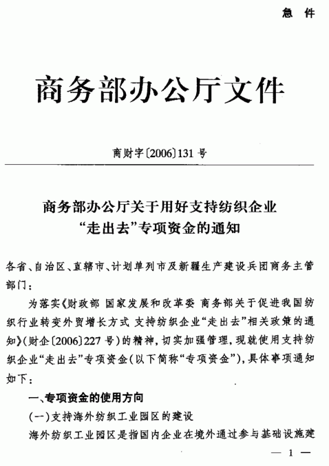 為了更好地促進(jìn)我市紡織行業(yè)的健康發(fā)展,有效地緩解貿(mào)易摩擦給我市紡織行業(yè)帶來(lái)的負(fù)面影響。同時(shí)為進(jìn)一步落實(shí)財(cái)政部、國(guó)家發(fā)展改革委員會(huì)、商務(wù)部促進(jìn)我國(guó)紡織行業(yè)轉(zhuǎn)變外貿(mào)增長(zhǎng)方式支持紡織企業(yè)‘走出去’扶持資金的實(shí)施和管理,加快我市紡織行業(yè)機(jī)構(gòu)調(diào)整,轉(zhuǎn)變我市紡織行業(yè)的增長(zhǎng)方式,F(xiàn)將商務(wù)部辦公廳“關(guān)于用好支持紡織企業(yè)‘走出去’專(zhuān)項(xiàng)資金的通知”轉(zhuǎn)發(fā)給你們,請(qǐng)遵照?qǐng)?zhí)行。