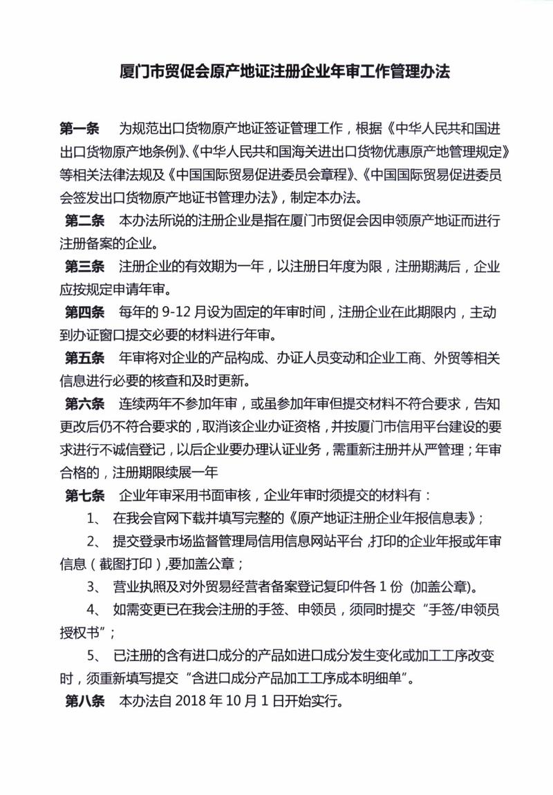 為方便辦證企業(yè),減輕企業(yè)負(fù)擔(dān),我會于2015年暫時(shí)取消備案企業(yè)的年審工作。三年來,切實(shí)減輕了企業(yè)的負(fù)擔(dān),但同時(shí)我們也發(fā)現(xiàn),有些企業(yè)在注冊信息變動或簽證人員變更時(shí)未及時(shí)主動到貿(mào)促會辦理相關(guān)手續(xù),造成備案資料與現(xiàn)實(shí)不符,影響簽證工作的正常開展。為此根據(jù)《中華人民共和國進(jìn)出口貨物原產(chǎn)地條例》、《中國國際貿(mào)易促進(jìn)委員會簽發(fā)原產(chǎn)地證明書管理辦法》有關(guān)規(guī)定,我會制定了《廈門市貿(mào)促會原產(chǎn)地證注冊企業(yè)年審管理辦法》,并擬于近期對2018年1月1日前注冊的企業(yè)進(jìn)行年審。請各企業(yè)于2018年10月31日前到貿(mào)促會辦證窗口提交《原產(chǎn)地證備案企業(yè)年報(bào)信息表》及相關(guān)資料。注冊企業(yè)如逾期未辦理年審,將根據(jù)管理辦法的有關(guān)規(guī)定進(jìn)行處理。