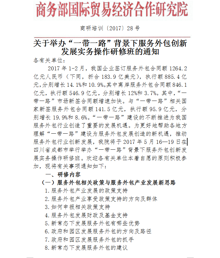 關(guān)于舉辦“一帶一路”背景下服務(wù)外包創(chuàng)新發(fā)展實務(wù)操作研修班的通知